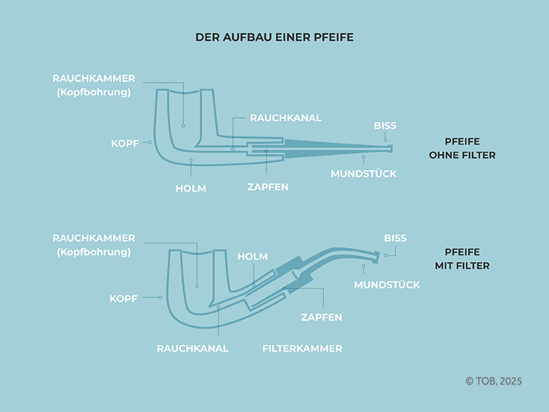 Eine Pfeife besteht aus 3 Teilen - dem Kopf, dem Holm und dem Mundstück. Im Kopf eingelassen befindet sich die Rauchkammer (Kopfbohrung). Hier wird der Tabak in die Pfeife gestopft und entzündet. Über den Zug am Mundstück wird über den Rauchkanal im Holm transportiert.
