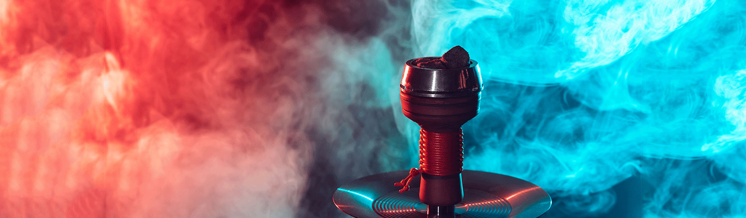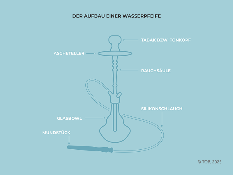 Eine Shisha besteht aus einem Glasgefäß in das Wasser gefüllt wird, einer Rauchsäule mit einem Schlauch und einem Mundstück. Auf der Rauchsäule findet sich der Ascheteller und ein Tabakkopf aus feuerfestem Material wie Ton.